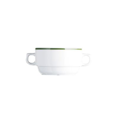 Die LILIEN Suppenobertasse aus der Grünband-Serie bietet mit 32 cl Füllvolumen und einem Durchmesser von 105 mm perfekten Platz für deine Lieblingssuppen. Ihr stapelbares Design spart Platz in der Küche. Die Tasse und die passende Untertasse sind spülmaschinengeeignet und erleichtern die Reinigung. Hol dir diese stilvolle Ergänzung für deinen Esstisch!